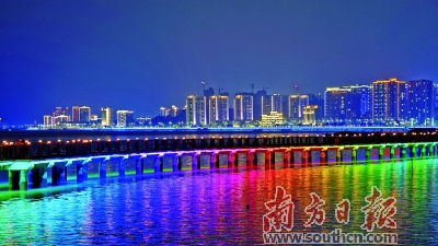 夜幕來臨,汕尾品清湖上的七彩海上棧道壯麗精明。南邊日報記者 陳欣欣 攝